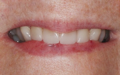 AfterThis patient struggled with chipping and spacing of her front teeth and was not happy with her smile. Using porcelain veneers, we were able to close spaces and lengthen her teeth with minimal preparation. This provided a natural, youthful smile that gave back her confidence.